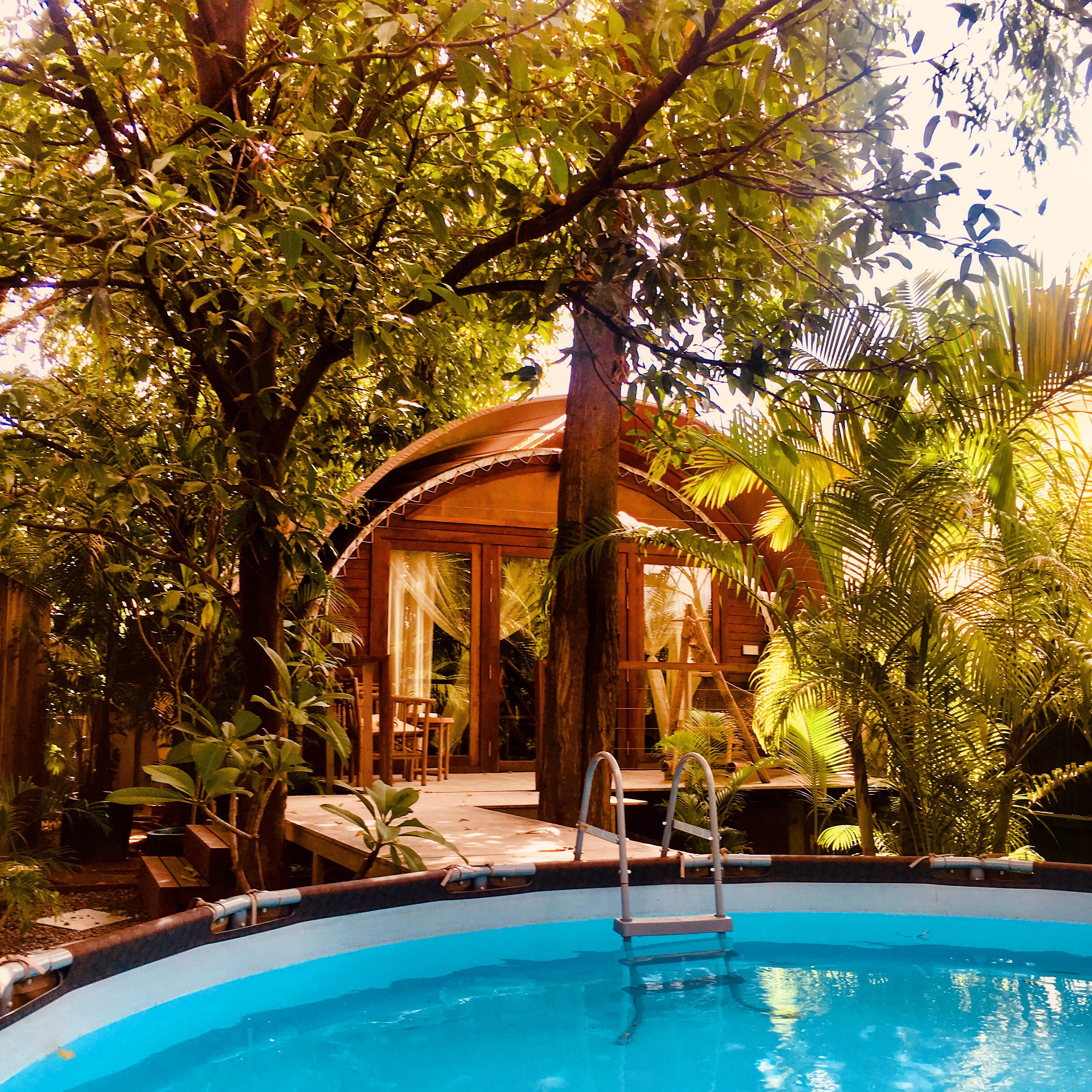 Back home I hang out by the common glassy green pool with some Mekong dry gin and Arundhati Roy’s The Ministry of Utmost Happiness. Dinner is a delicious fish amok under the lantern-hung trees, with my calico friend nearby.